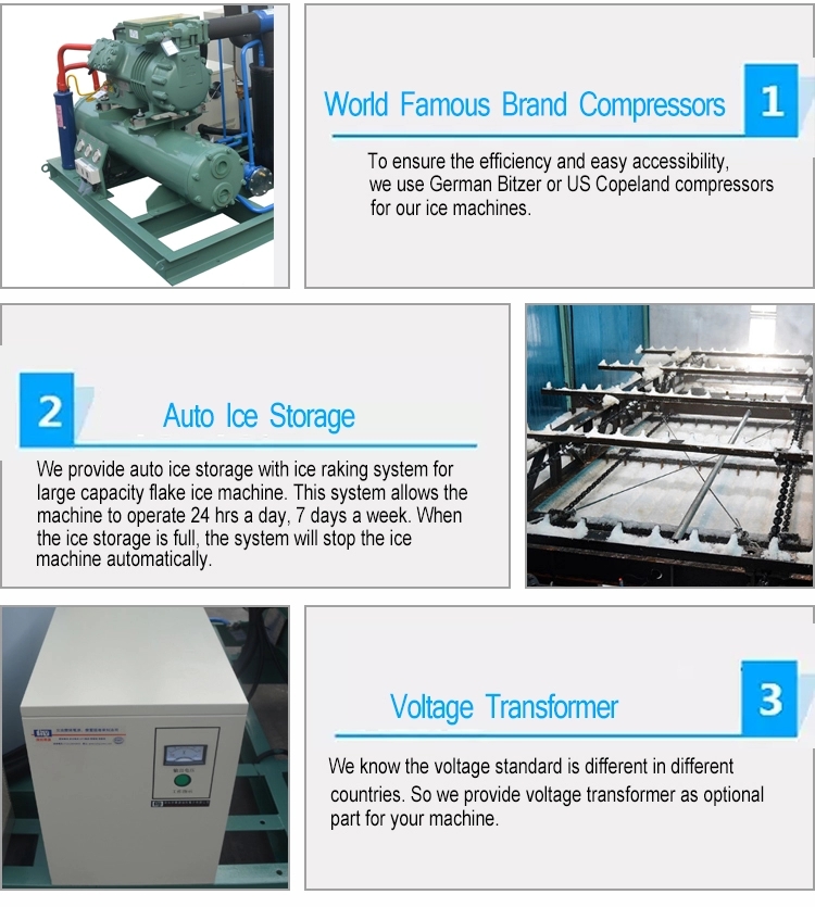 This commercial big industrial flake ice machines are mainly used in aquatic processing, nuclear power construction, environmental protection engineering, transportation and railway construction, mine cooling and freezing, artificial ski resort, medicine and chemistry, concrete mixing engineering etc. And the ice production from 20000kg/24h to 60000kg/24h,which can meet the industiral ice demand.Customers can choose the complete set or separate set according to the different application.